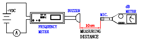The oscillation frequency, current consumption and sound pressure are measured by the measuring instruments shown below